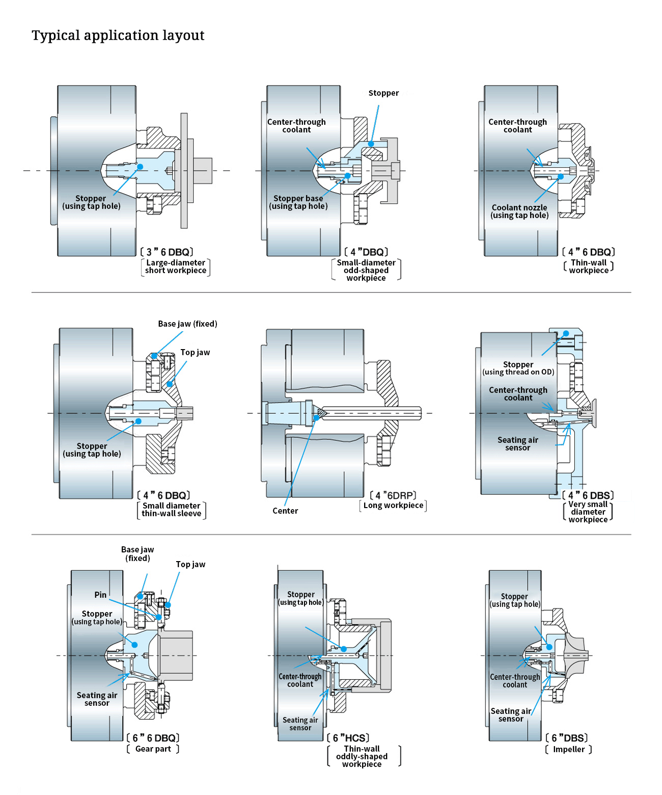 Workpiece stopper, through coolant and seating air sensor are easily feasible. QC (Quick Change) jaw is also available.